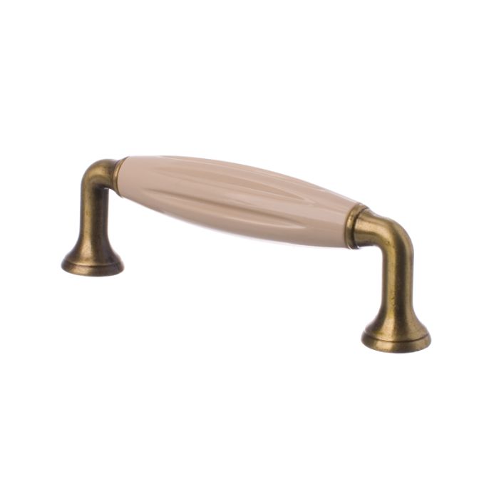 Handtag av Zamak och plast, bronsoxid / beige, c/c 96 mm. Levereras inkl. M4-skruv.