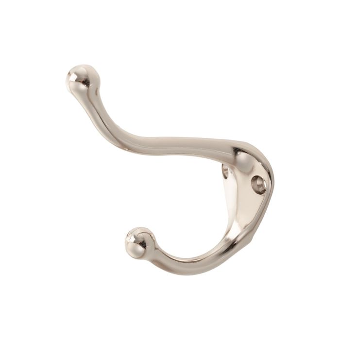 Krok / Klädhängare 'Bremm' i Zamak, Blank Nickel, dubbelkrok för väggmontering med två skruvar framifrån.
