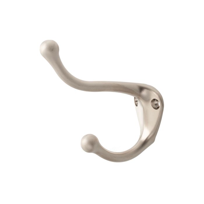 Krok / Klädhängare 'Bremm' i Zamak, Matt Nickel, dubbelkrok för väggmontage med två skruvar framifrån.