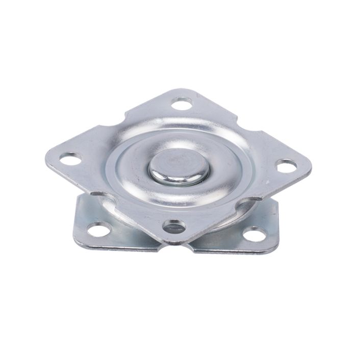 Vridplatta av galvaniserat stål, max 50 kg belastning. Fästes med träskruv mellan två skivor. Storlek: 57x57 mm. Roterar 360°.